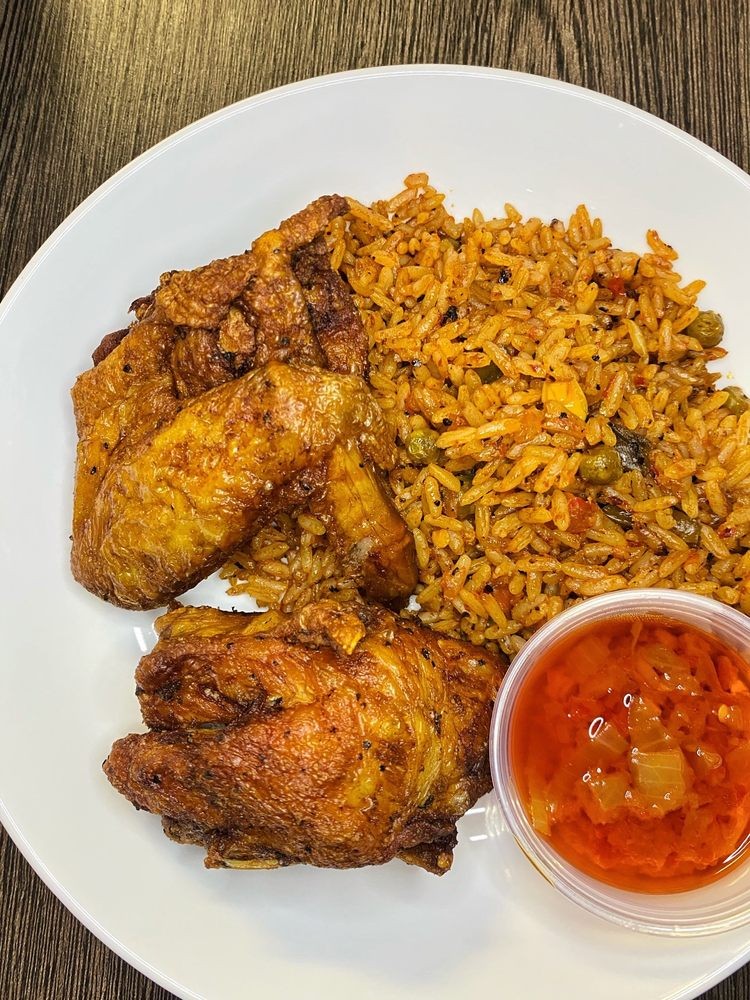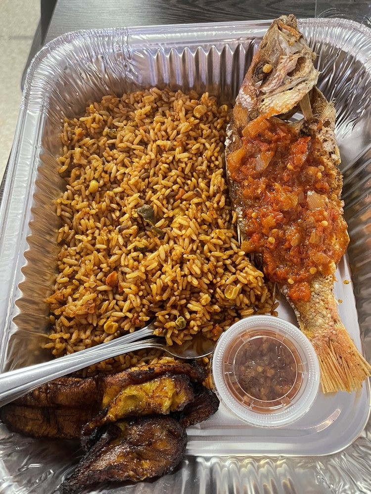 African Restaurant - jollof rice, suya, goat soup, dried rice, plantain, fufu, attieke